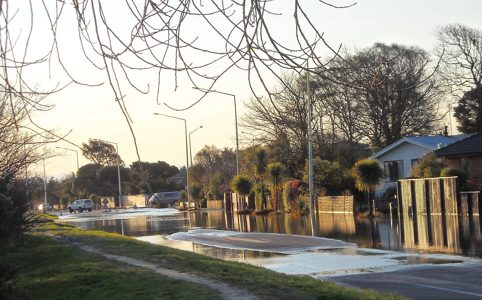 New Brighton Rd, New Brighton: Flooded in places, detours by Avon River. Masses of flood-water sucked into road-drains more than 12 hours post-quake. Some gardens flooded.