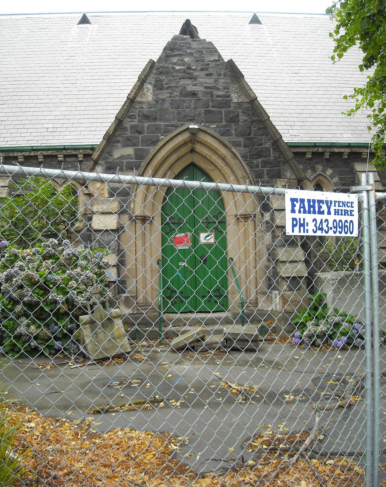 Hereford St / Madras St: Steel-mesh-fence-cordoned, St Johns Anglican Church ruin had a patched-roof. The greystone, belfry-tower was kaput. Greystone, rubble-heaps were everywhere. Weeds, leaves & overgrown grass were everywhere. North transept gable & rose-window was boarded. Greystone nave: north green-door, red-stickered, gable-stones fallen. Nave west wall: steel-braced, Madras St side. (St Johns would be trashed by the 22 February 2011 quake & demolished. Shigaru Ban's Cardboard Cathedral would be built on site). Steel-mesh-fence-cordoned, next door brick-ruin: roof-boarded, brick-gable toppled. Post 22 February 2011 quake, the brick-ruin would be demolished for the Cardboard Cathedral.
