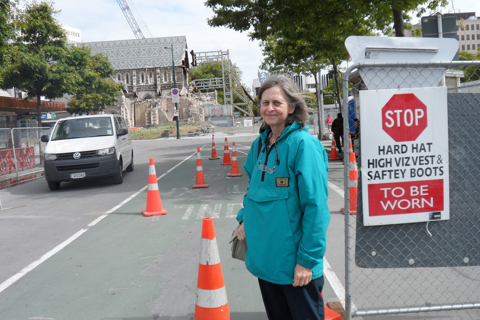 Christ Church Cathedral, CCDU Blueprint focus. Thurs 27.12.12, Xmas - New Year holiday time. Gloucester St: Parked by Latimer Hotel rebuild, so Leah & I could visit ruined Christ Church Cathedral. Trekked W along CERA demolished Gloucester St.