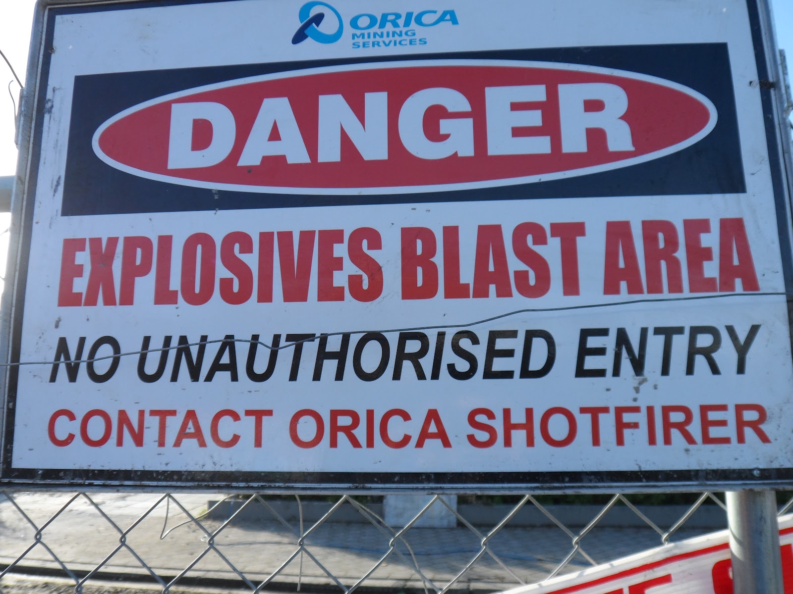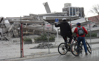 Worcester St: By the steel mesh fence cordon, cyclists viewed the implosion rubble heap. Blue detonator cord, behind shipping containers protecting the ghost Clinic, snaked under the steel mesh fence cordon to the implosion site. I was the only observer wearing a dust mask. I didn't stay long, I feared silicon dust from crushed concrete.