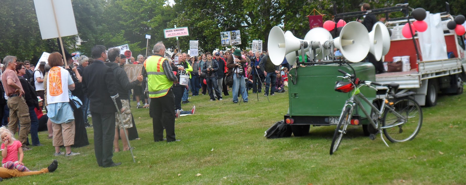 2010-2011 was the year of big quakes. 2012 was the year of big protests, where Christchurch citizens aired grievances. Formats same, backdrops different, hired loud speakers & bull horns same, same soloists, pop-up understudies at every show.