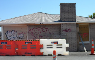 Wainoni Rd: Tagged shops, near Bickerton St junction, opp Porritt Park: Closed surgery wall, window, rubbish bin, tagged. Fish & Chips shop side wall, tagged. Other shops windows, tags etched on glass. Yellow bldg on Bickerton St cnr, tagged. Avonside Dr: Tags on several ghost houses, opp Porritt Park.
