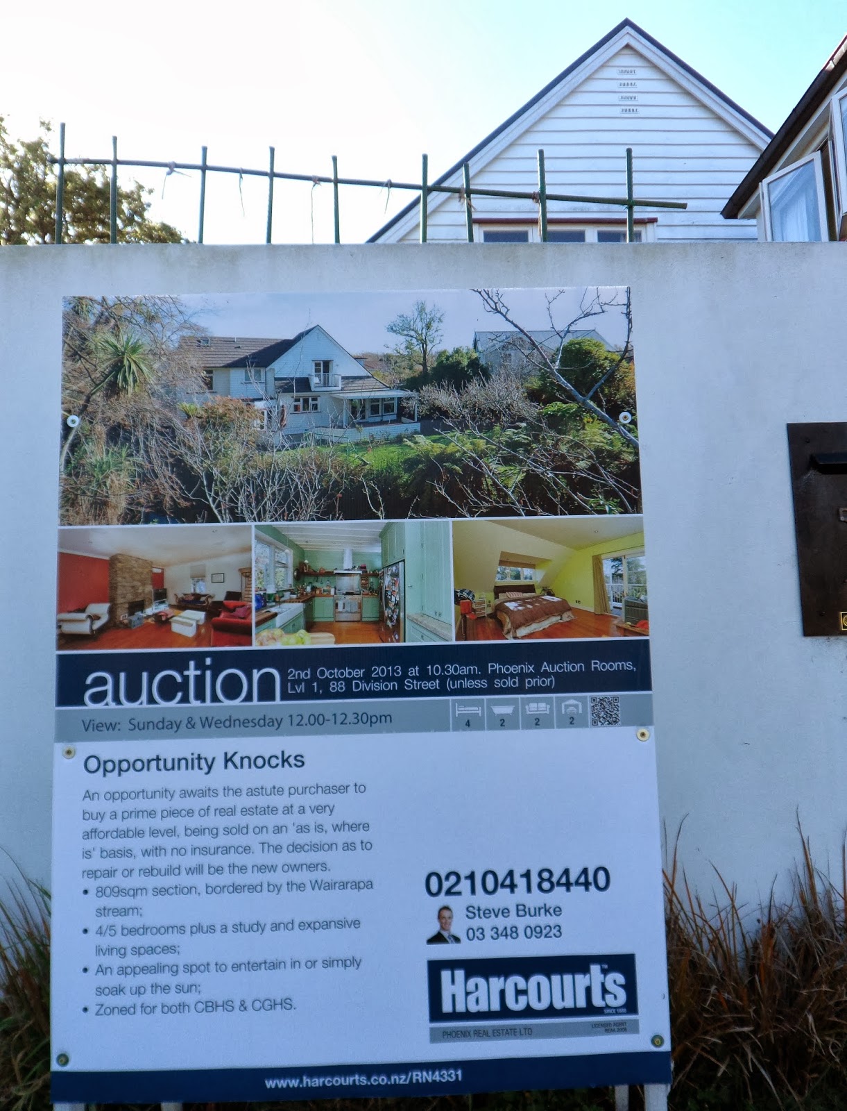 Quake survivor, wooden, road bridge over Wairarapa Stream, concrete abutments OK. Collapsed brick & tile house, Wairarapa Tce off Garden Rd. Three years trekking post 4 September quake, thought I'd seen it all, but still spooked seeing collapsed housing for the first time. HARCOURTS Auction board: uninsured, 2 storey, wooden house. Another 2 storey, wooden ghost, unrepaired top storey cnr.