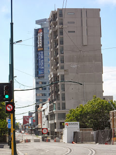 15.12.13. Kitsch mural right, Gloucester St demolition site, abandoned Sampan House left, repaired / reopened Pacific Tower / Rendezvous Hotel middle, CCDU's core CBD. Sampan House would survive the quakes